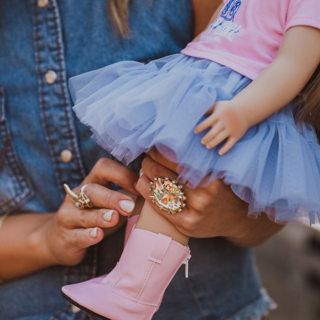 - 3-piece Anne Wilson outfit: Official tour shirt, blue tulle skirt, and pink cowgirl boots